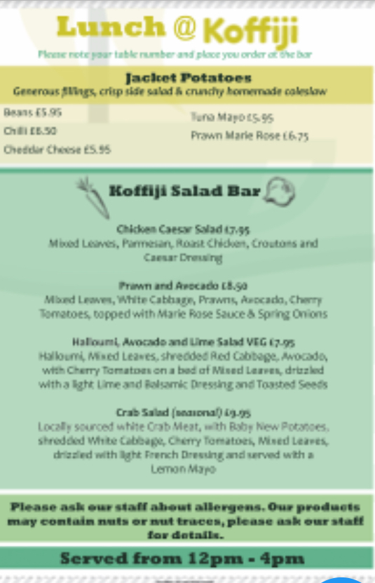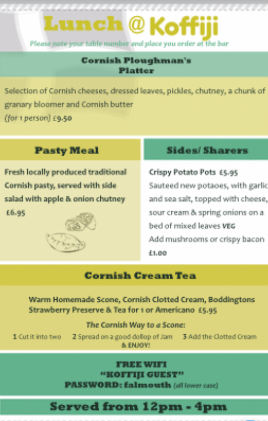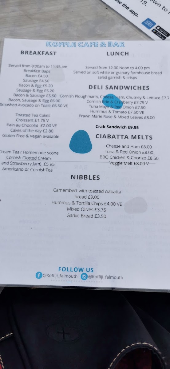 Koffiji Cafe Bar in Falmouth offers a menu that balances classic breakfast comforts with satisfying lunch options. Breakfast begins with the wholesome Granola, Greek Yogurt & Fresh Fruit, or indulgent pastries like the Raspberry Croissant and the Plain AU Chocolate Croissant With Ham & Cheese. For a heartier start, the Salmon, Fried Egg & Avocado dish stands out as a fresh, protein-packed choice. Lunchtime sees a shift to more substantial fare with the Margherita Pizza and Pepperoni Pizza, both capturing the essence of a simple, well-executed pizza. Sandwich lovers can enjoy the Hummus & Tomato Deli Sandwich, the classic BLT Deli Sandwich, or the regional favorite, the Cornish Ploughmans Deli Sandwich, each thoughtfully prepared to highlight fresh ingredients. Across the menu, Koffiji balances affordability with quality, making it a versatile spot for both a leisurely breakfast or a relaxed lunch in the heart of Falmouth.